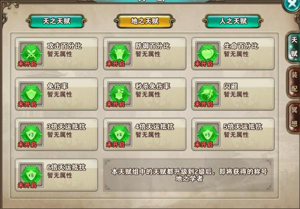 每個(gè)天賦滿級(jí)10級(jí),點(diǎn)擊對(duì)應(yīng)天賦可查看每級(jí)的屬性數(shù)值,剛開(kāi)始時(shí)所有天賦還是未激活狀態(tài)