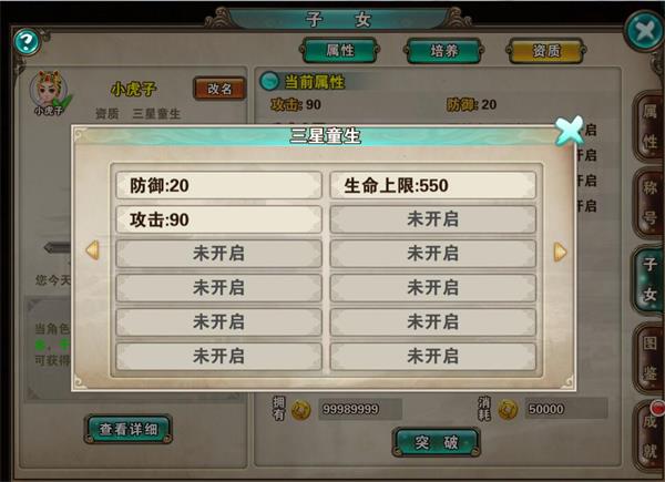 每當(dāng)子女當(dāng)前資質(zhì)等級(jí)經(jīng)驗(yàn)充滿的時(shí)候可消耗對(duì)應(yīng)材料突破資質(zhì),每突破一層資質(zhì),子女將獲得額外的加成屬性,資質(zhì)等級(jí)達(dá)到特定等級(jí)時(shí)可解鎖更多的屬性,子女資質(zhì)滿層80層。