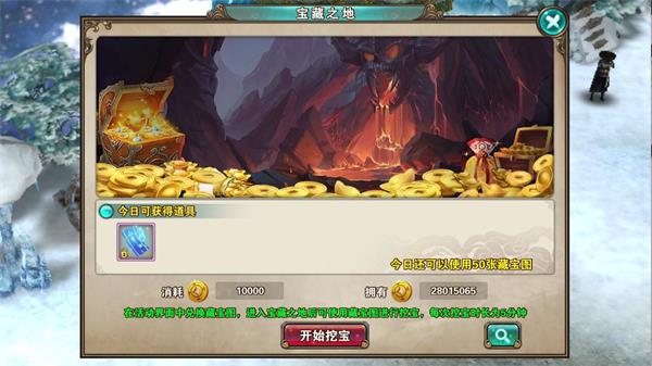 每次挖寶角色都需要一張藏寶圖,藏寶圖可在“福利”界面神秘尋寶中兌換或在商城中購(gòu)買。