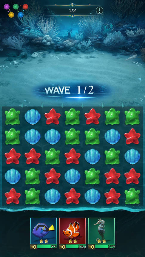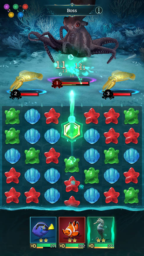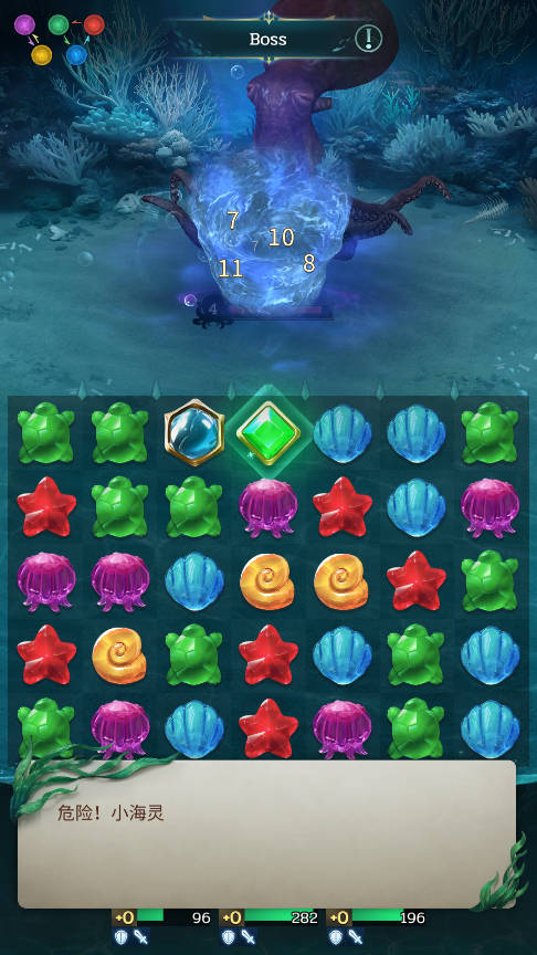 5、守關野生生物的血量條左側會顯示反擊回合數,利用這個信息,你可以在敵人還未反擊時進行有效的棋子消除。在空閑時間內多消除棋子,能夠為你的海靈積攢雙倍怒氣,為接下來的攻擊做好準備。
