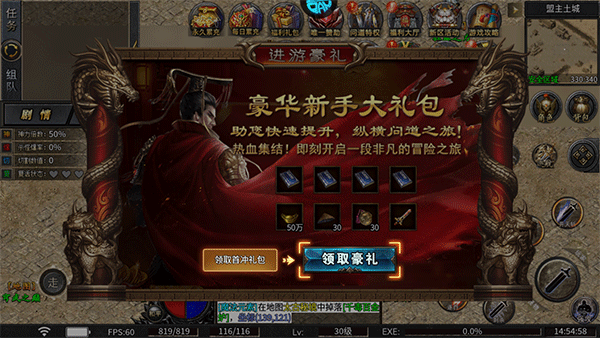 3、首次進入送豪華新手大禮包,助你快速提升,縱橫問道之旅,點擊領取豪禮并進入游戲;
