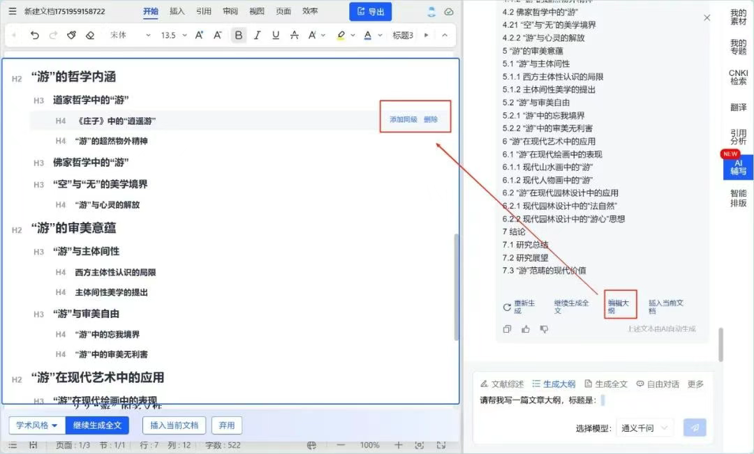 點擊【編輯大綱】,進入大綱編輯模式,根據自己的寫作想法,對論文大綱進行編輯各級標題、添加同級和子級、刪除章節等的修改,使論文邏輯更加順暢,符合自身需要。
