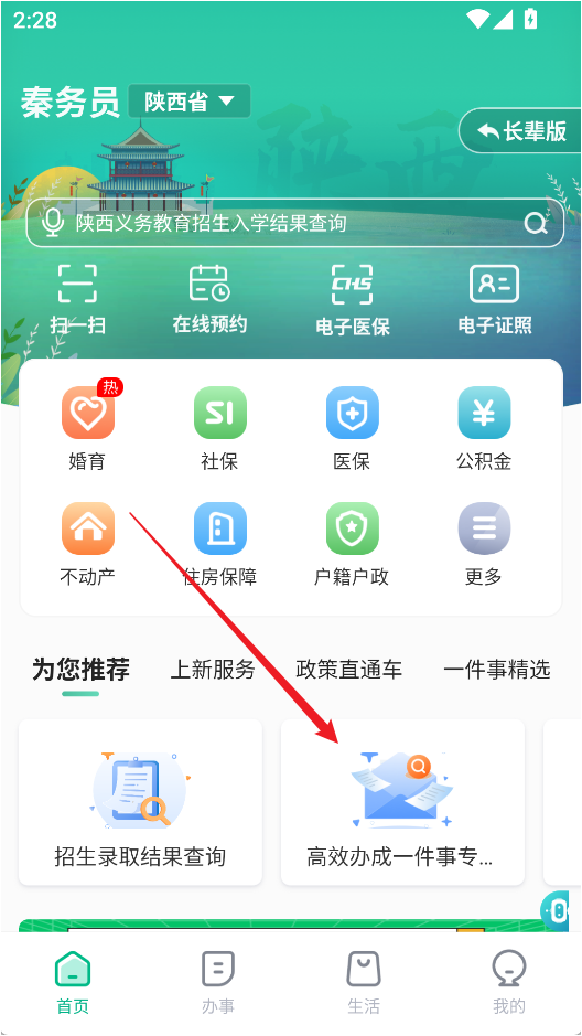 1、打開秦務員App,進入首頁并點擊「高效辦成一件事專區」,選擇「教育入學一件事」。
