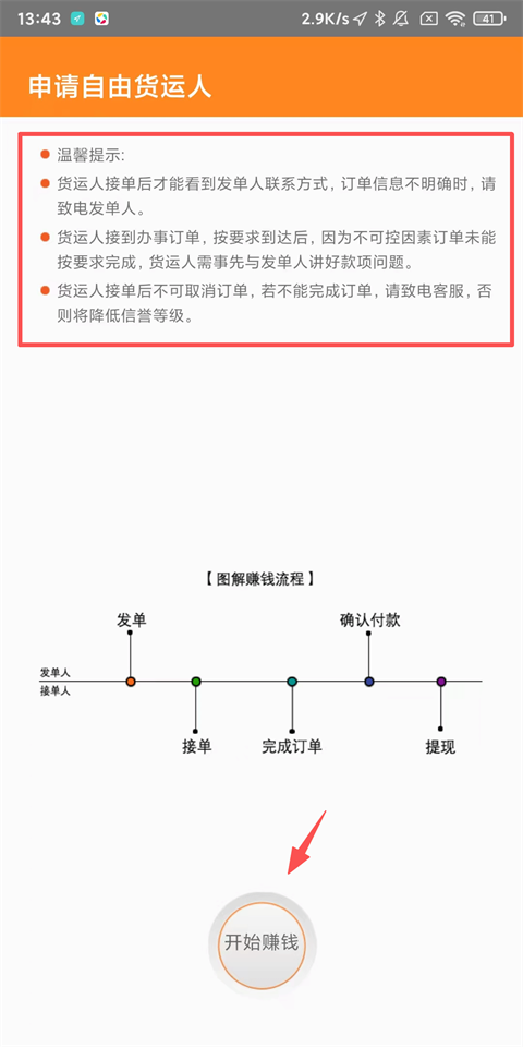 3、仔細閱讀申請自由貨運人溫馨提示,隨后點擊開始賺錢;