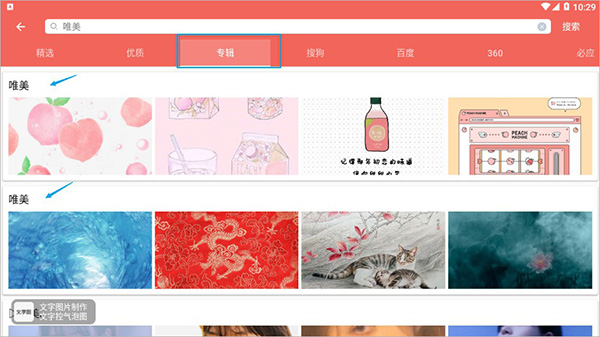 4、另外,你在搜索圖片的同時,圖片大全搜圖神器還能鏈接到優質、專輯、搜狗、百度、360、必應六大模塊里面去;
