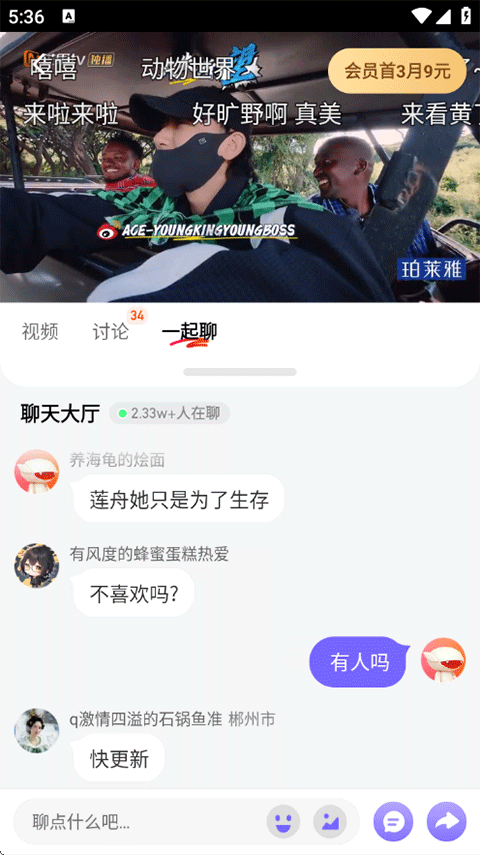 2、進(jìn)入播放頁后點擊一起聊,和大家一起實時觀看,交流影片內(nèi)容;
